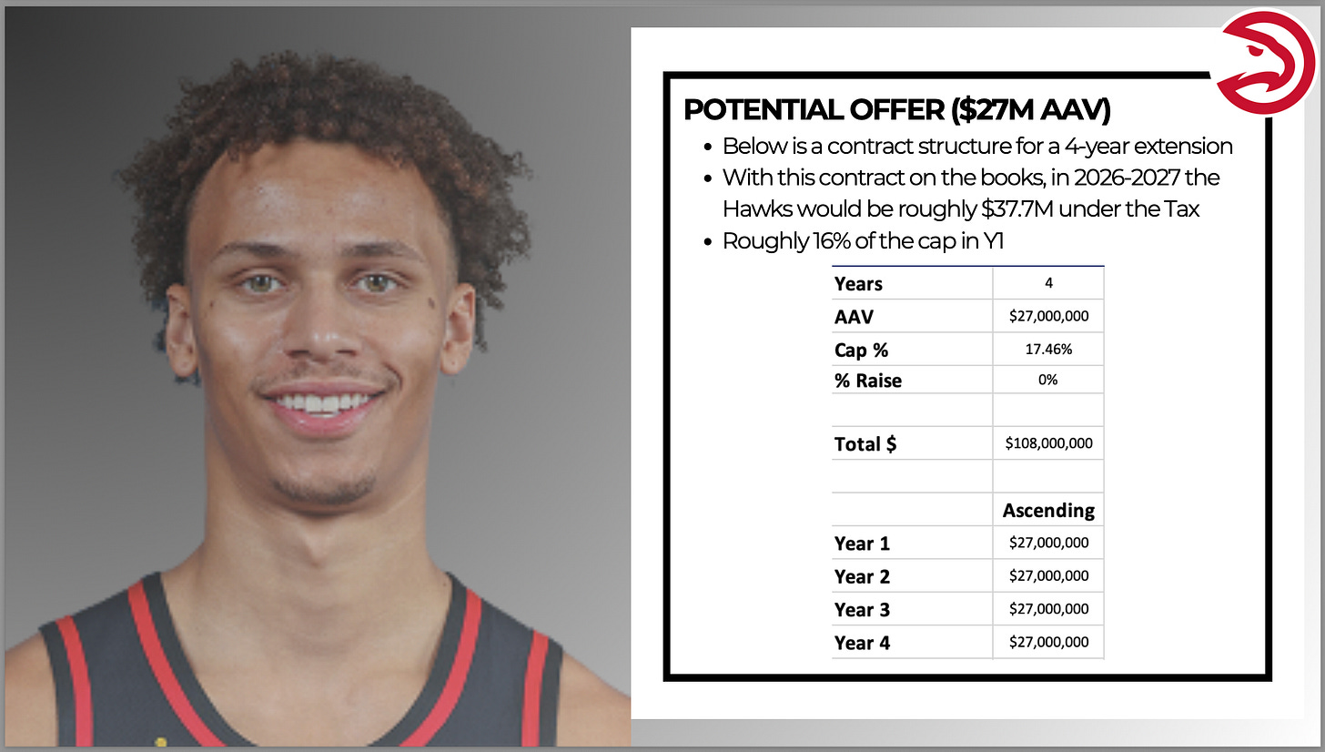 This contract lands in the middle of the valuation range, with a Year-1 salary of $27M, which would be roughly 16% of the projected Cap. It would be a flat structure, and across the entirety of the deal, the corresponding Cap percentage would be roughly 13-15%. The Hawks, as currently constructed, would have approximately $37.7M in Tax space with 11 contracts on the books. This means that with a fully filled out roster, the team would still have wiggle-room. However, this financial situation lacks a potential Young contract (presuming he declines his PO), and does not include a deal for Porzingis, which will also carry a certain amount of weight if the Hawks want to pursue a long-term deal, further raising the Team Salary.