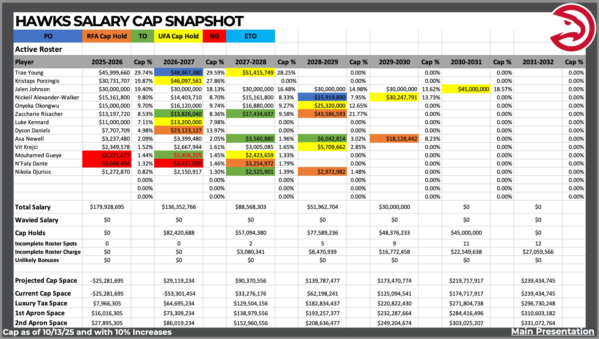 The Hawks head into the 2025-26 season with $27.8M in 2nd Apron space and $16M of 1st Apron Space. The team is $7.9M under the Tax and is currently Hard-Capped at the 1st Apron due to acquiring Luke Kennard with the NTMLE and Nickeil Alexander-Walker via sign-and-trade. The team currently has 13 guaranteed standard contracts on the roster (which means that it will need to add another player at some point soon), and all 3 of its Two-Way slots filled. Regarding extension-eligibility for players of note, Daniels is extension-eligible until October 20th, with Young and Kristaps Porzingis being extension-eligible in-season. The Hawks’ 2025–26 Cap sheet is relatively balanced: one near-max contract, two salaries over $30M, and two more above the NTMLE. There are no Unlikely Incentives on the books. This balance and relative Cap Sheet health can carry forward.