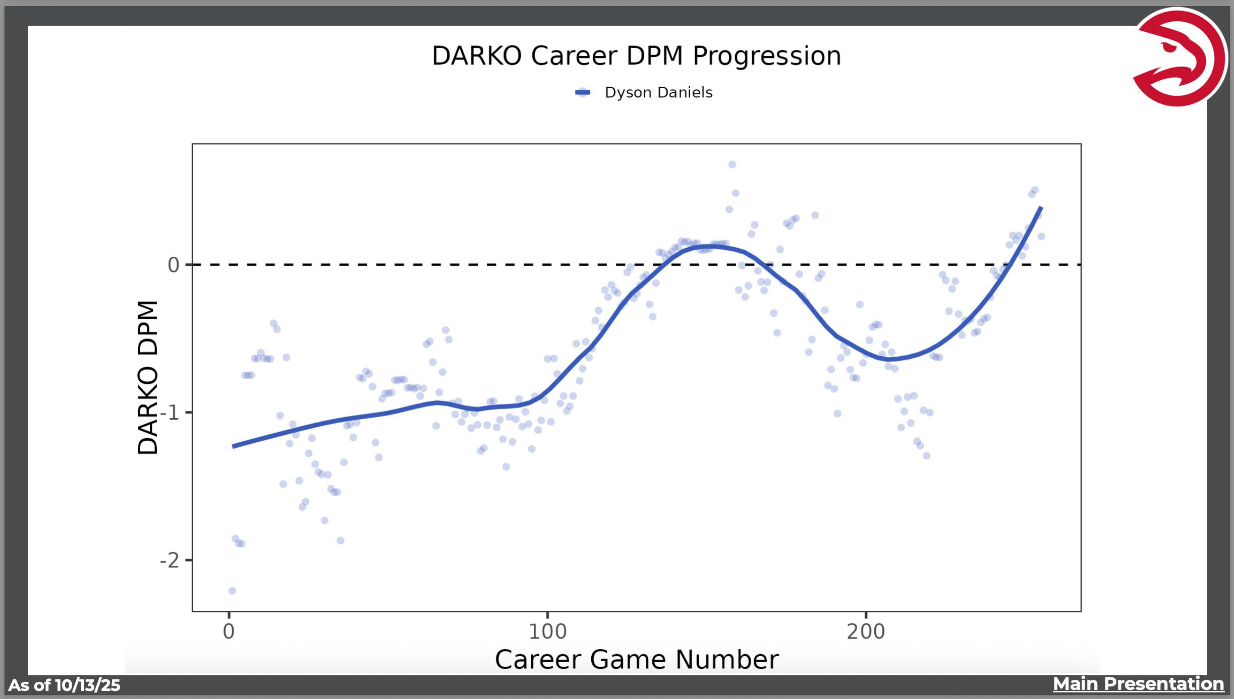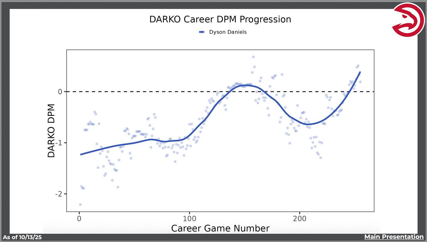 Asset Value Preservation – Even if Atlanta ultimately views Daniels as more of a high-end role player than a potential star, locking him in early protects asset value. Cost certainty matters, specifically for a 6’8” guard who can defend 1–3, handle secondary creation, and play on-or-off the ball. And if he were to take a step forward with his shot or overall offensive game, then his value would increase.