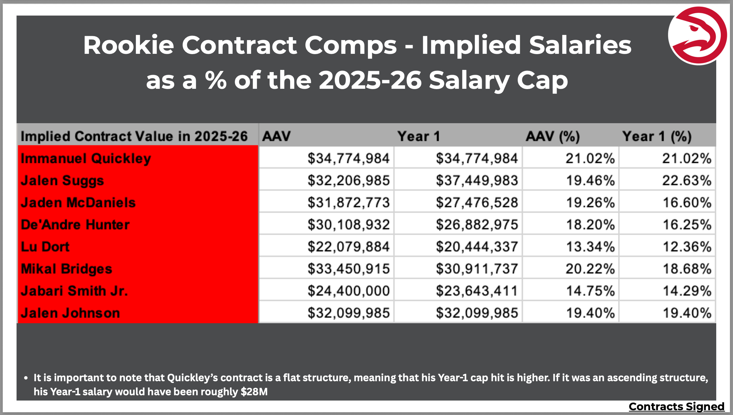 From Daniels’ perspective, his camp can: argue that players of his archetype are increasingly valuable and should be compensated accordingly; highlight his production and awards as justification for his demands, and be a reason as to why potential RFA market interest could materialize; emphasize that, at 22, Daniels has ample room to grow and is currently on an upward career trajectory; showcase Daniels schematic value to the team; point to his fit within a potential Young-led timeline or post-Young roster built around Johnson and Risacher; lean on market and organizational precedent to support his asking price; stress that, with a rising Cap, a deal at the higher end of the range will likely age well; and show that signing him would allow the Hawks to begin taking steps elsewhere upon other pathways to sort out its Cap Sheet moving forward.
