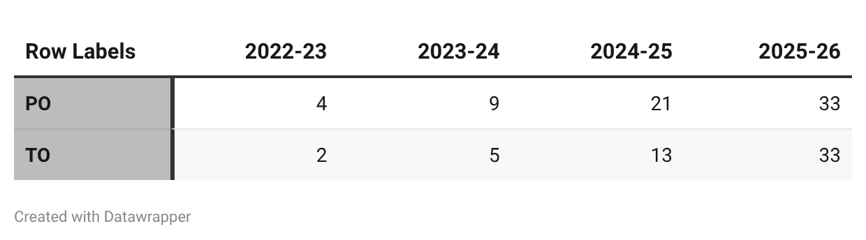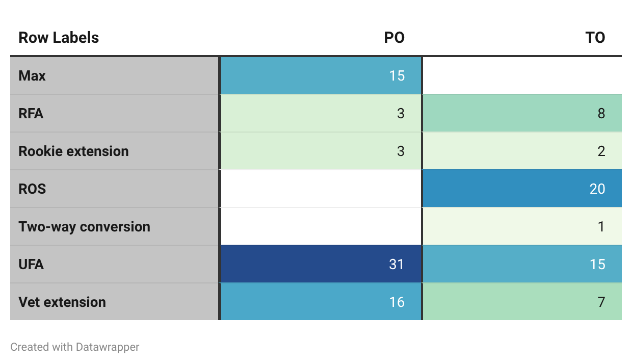 Both POs and TOs have surged in recent signing classes, but for different reasons. TOs have risen as a tool for protection and roster flexibility, while POs have spiked, most notably in 2025–26, reflecting a parallel increase in players prioritizing optionality in a more constrained financial environment.
