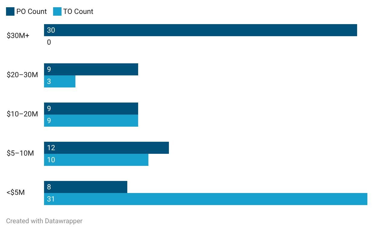 Negotiating leverage begins to shift slightly below this $30M tier. In the $20–30M range, POs still dominate (75%); however, TOs begin to appear, suggesting teams gain modest structural protection once salaries fall outside the elite tier.